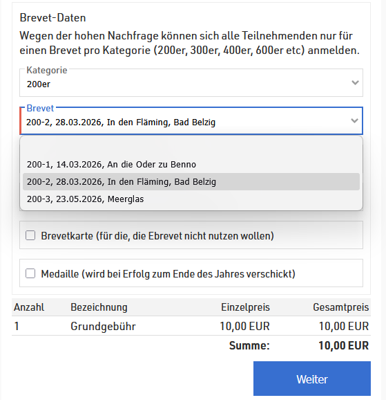 Das Anmeldeformular wird auf unserer Seite integriert sein und ab 31.1.2026 freigeschaltet. Pro Brevet-Kategorie kann pro Teilnehmenden ein Brevet gebucht werden, so wie in den Vorjahren auch. Dabei zählen Abschluss-200er und FLINTA*-200er als eigene Kategorie. Das heißt, erst Kategorie wählen, dann Brevet auswählen: