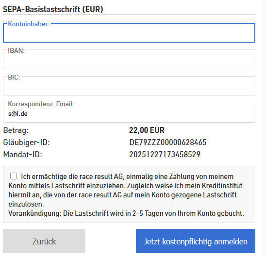Bei der Anmeldung gehen wir neue Wege. Ab diesem Jahr nutzen wir Race Result, einen externen deutschen Anbieter. Das hat für uns mehrere Vorteile, z.B. entfallen die eigene Teilnehmerdatenbank(-pflege) und die manuelle Kontrolle der Zahlungseingänge. Anmelde-Mails gehen an Race Result (europäische Server) und nicht mehr über Gmail. Das erspart uns sehr viel Zeit. (Bedenkt, wir machen das unentgeltlich in unserer Freizeit)