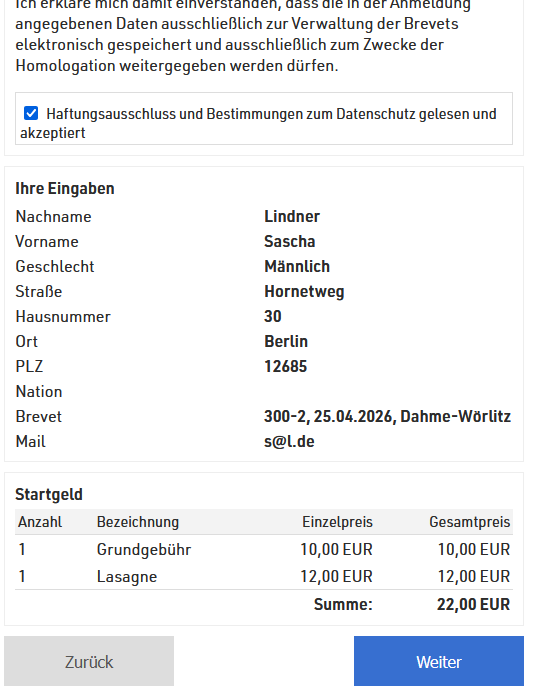 Anders als in den Vorjahren wird sein, dass man sich (aus technischen Gründen) für jedes Brevet einzeln anmelden muss. Wir hoffen, Ihr könnt mit dem zusätzlichen Tippaufwand leben. Das wird bei vielen anderen Standorten aber auch so gehandhabt.